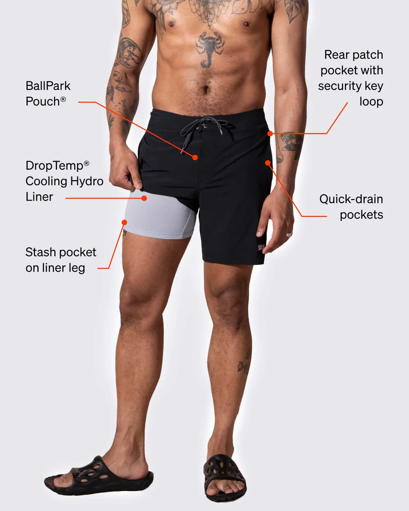 DropTemp™ Cooling Hydro Liner, BallPark Pouch™, rear patch pocket with security key loop, front pockets, stash pocket on liner leg, fade-resistant shell, odor-resistant liner, quick-drain pockets.