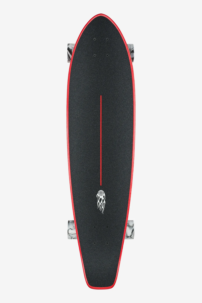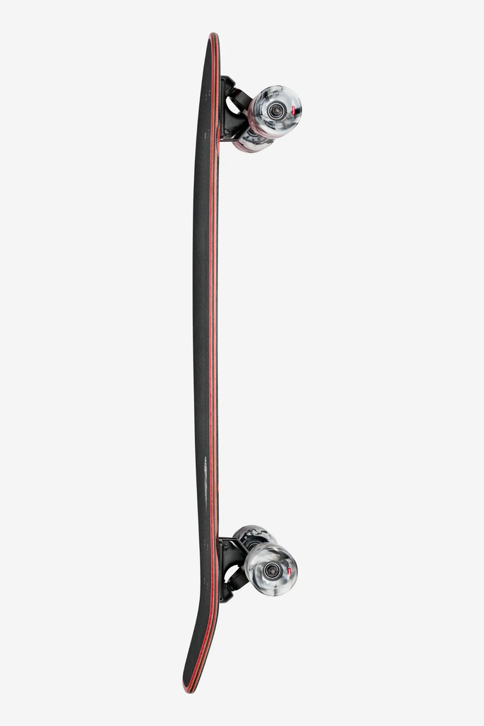 •35.875in x 9.0in x 22.25inwb•Resin-8 hard rock maple•Mellow concave with kicktail•150mm Slant reverse kingpin trucks•65mm 78a Conical Cruiser wheels•Die-cut griptape with print
