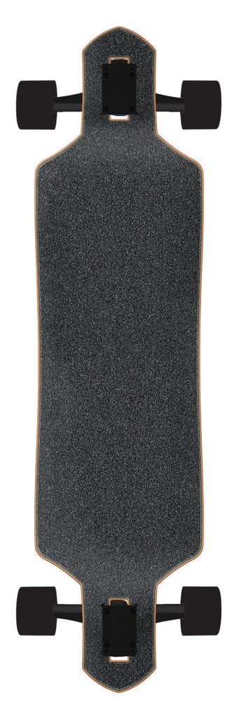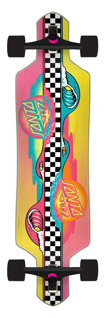 Santa Cruz Skateboards Sundown Stripes Drop Thru Longboard Cruzer featuring half tone fade transparent spot gloss graphic on medium sized drop through shaped 9 ply deck with Bullet 180mm reverse kingpin downhill trucks and 66mm, 78a Santa Cruz branded Slime Balls wheels.